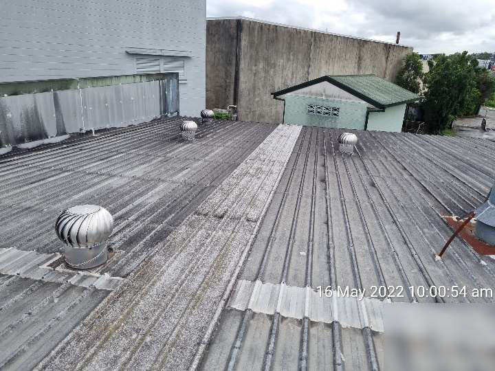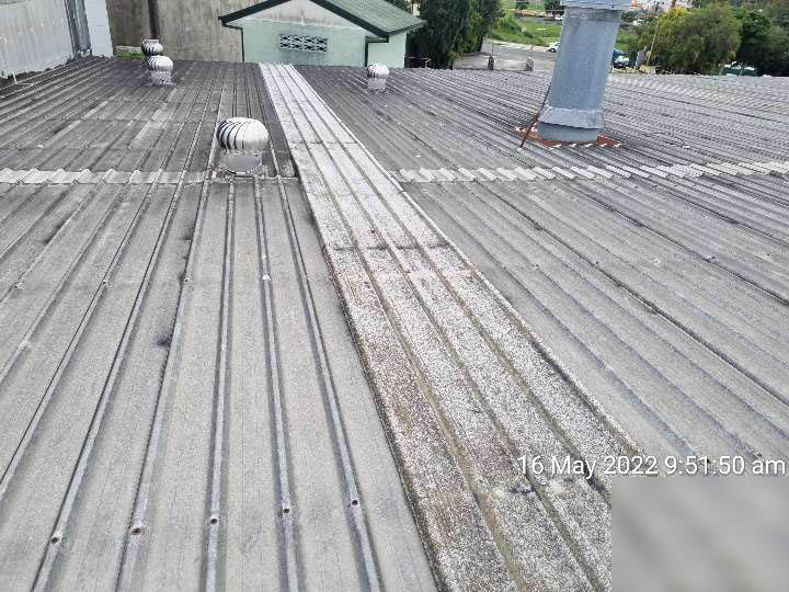 • Roof sheeting has reached the end of its life span. The roof has suffered numerous repairs in a failed attempt to remedy the ingress. Typically, these failed repairs have resulted in further corrosion of the sheeting. Also note that the roof screw fasteners are also corroded and require replacement.