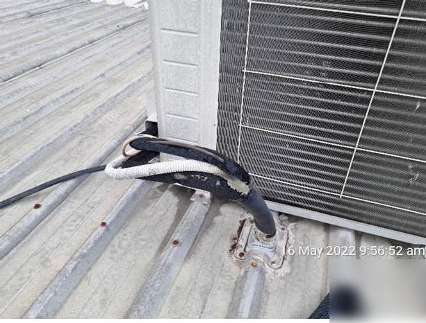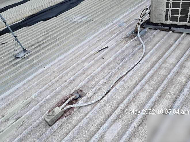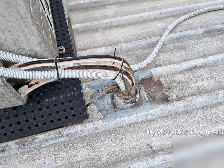 • Numerous Air Condition / mechanical unit penetrations are heavily reliant on tape and silicone which provides no longevity. Several mechanical penetrations are experiencing ingress. Installing numerous cables to a singular Dektite flashing in this manner is noncompliant to Manufacturer’s Instructions.P.V.C gooseneck shrouds should be provided to ensure a long-term