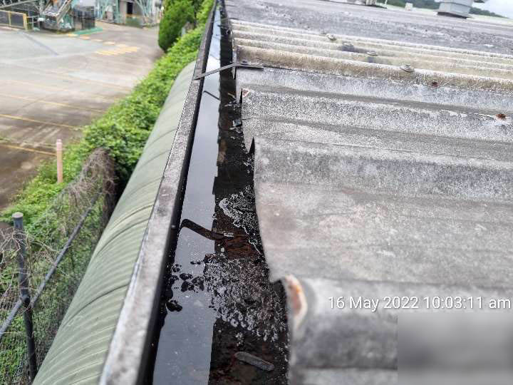 • Eaves gutters are suffering from heavy ponding due to a lack of effective gradient. This results in rapid corrosion of the guttering material. Non-compliant to AS 3500.3 refer 4.5.3. Also note that the Eaves gutters have not been provided any provisions for thermal expansion and will result in failure of the guttering joins. Non-compliant to SA HB39 refer 5.6.