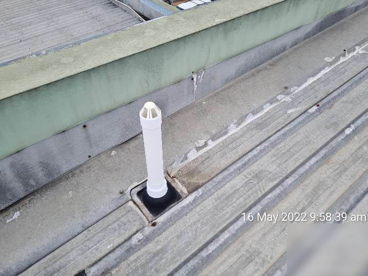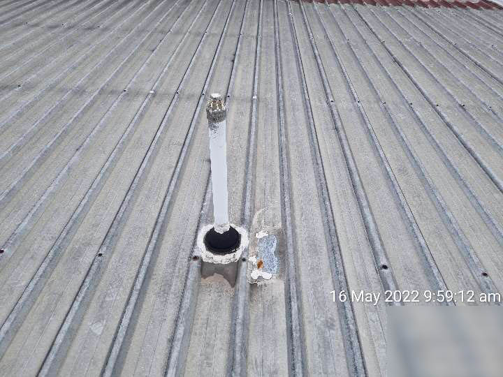• Several penetrations have blocked the flow of water through the sheet pan and are non-compliant to AS 3500.3 refer 4.4.3. above and Bluescope Manufacturer’s Technical bulletin attached. This results in rapid corrosion of the sheeting.All penetrations that block the flow of water require dry pan flashings with a compliant coverage.